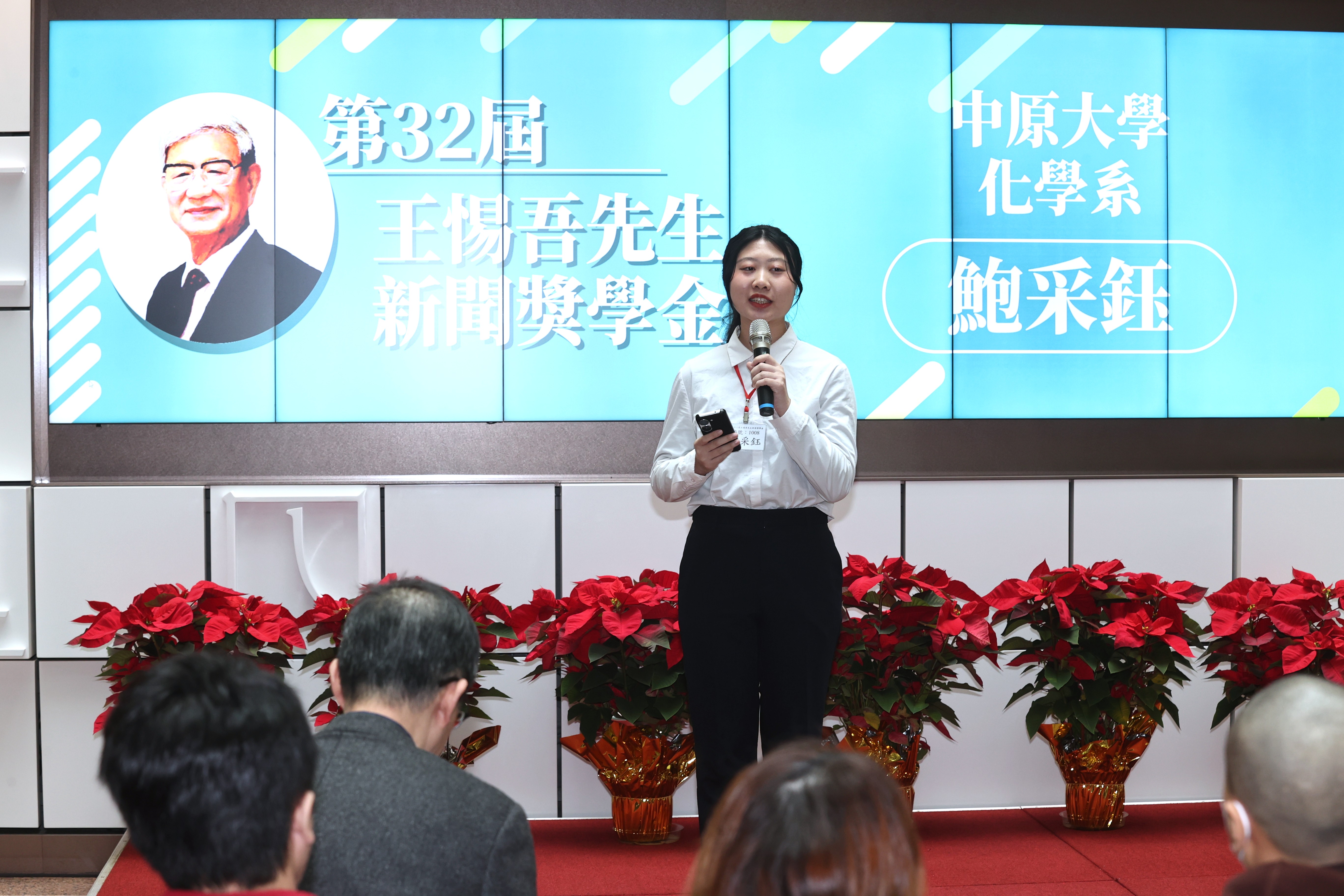 各位貴賓、各位獲獎同學,大家好。我是來自中原大學化學系四年級的鮑采鈺,很榮幸能站在這裡,分享我的感言。