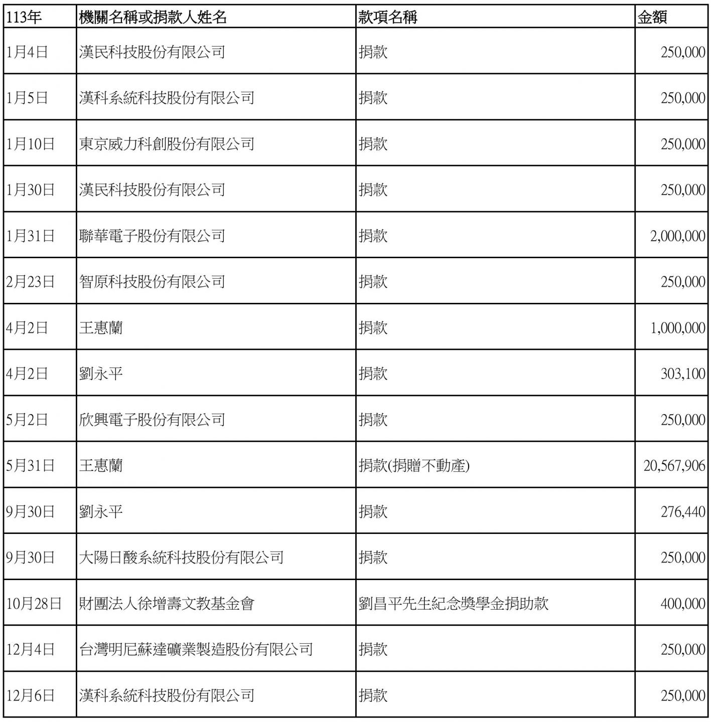 113年接受捐贈清冊