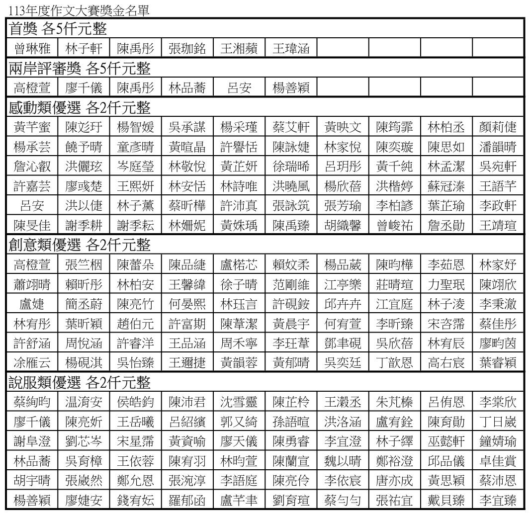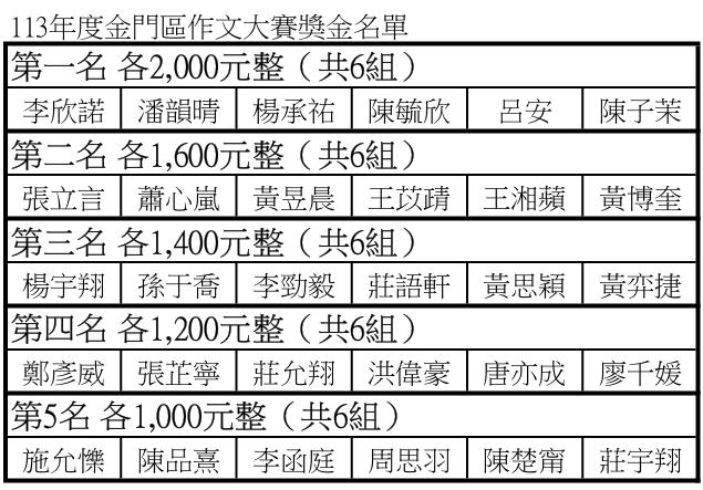 113年聯合盃作文大賽金門區-獎助名單清冊